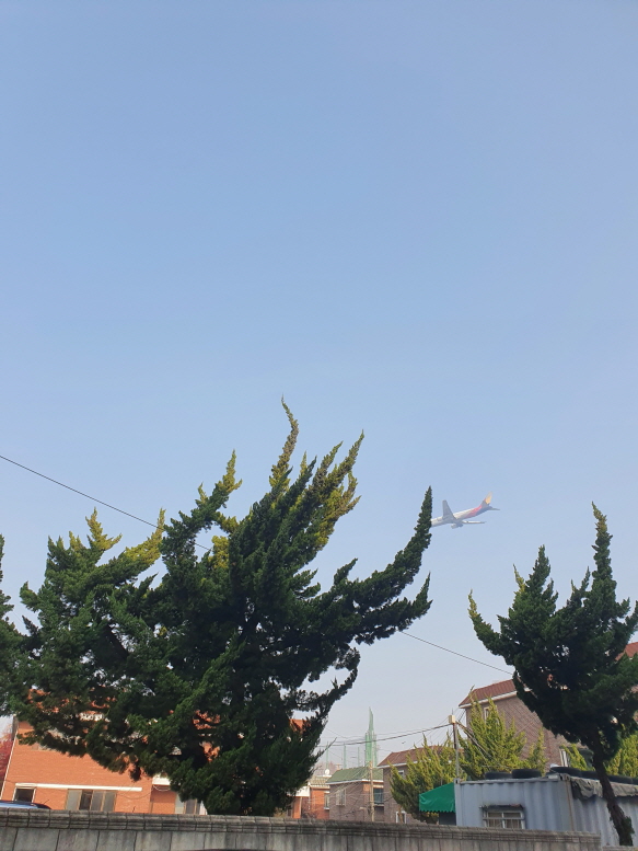 정말 찍고 싶은 순간이 있었는데 놓치고 겨우 한 장 건졌다. 신정역에서부터 여기까지 걸어오면서 거의 5분 간격으로 비행기 소리가 들렸다. 엄청나게 큰 소음은 아니었는데, 그래도 이 지역에 살면 계속 신경이 쓰일 것 같았다.