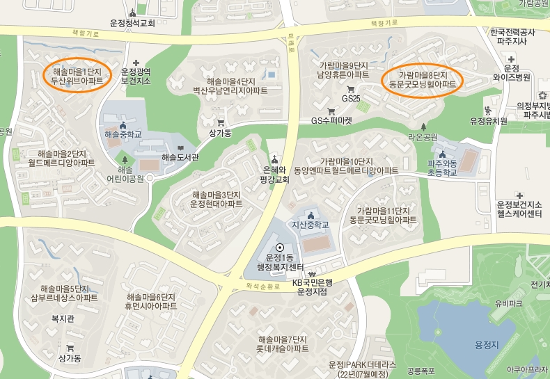 해솔마을 1단지 두산위브 아파트 역시 역세권이 아니다. 새로 생길 GTX-A노선의 운정역과도 거리가 좀 있다.
