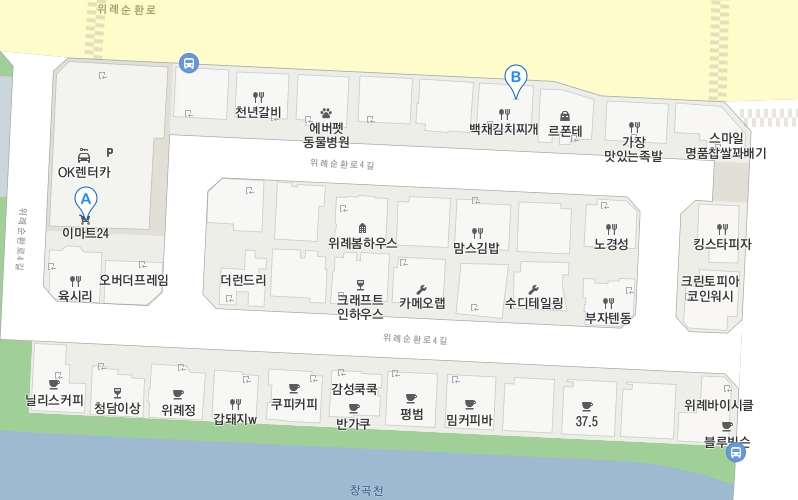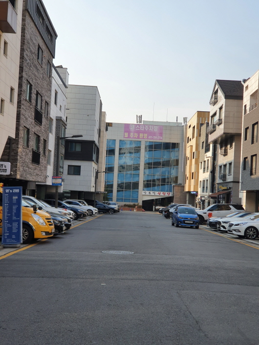 주차장 건물인데 주변은 단독주택 용지로 1층은 상가, 2층부터는 주택인 건물들이 있었다. 특히 창곡천 쪽으로는 멋진 가게들이 많이 보였다.