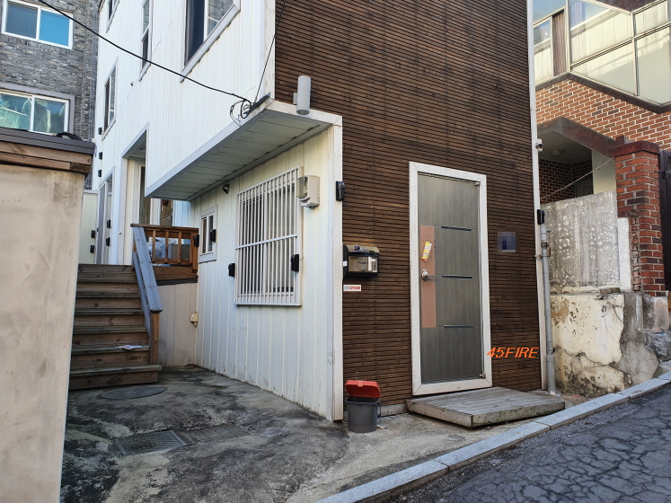 입구는 두 개로 전면에 지하 작업실로 가는 입구가 있고 왼쪽으로 보이는 계단으로 올라가면 옆면에 1층으로 가는 입구가 또 있다. 화장실도 두 개라서 공간을 나누어서 임대를 주는 것도 가능하다는 견해도 있었는데 아래쪽 화장실에는 샤워 시설이 없어 보여서 두 가구에게 임대를 주는 것은 어려울 것 같았다.