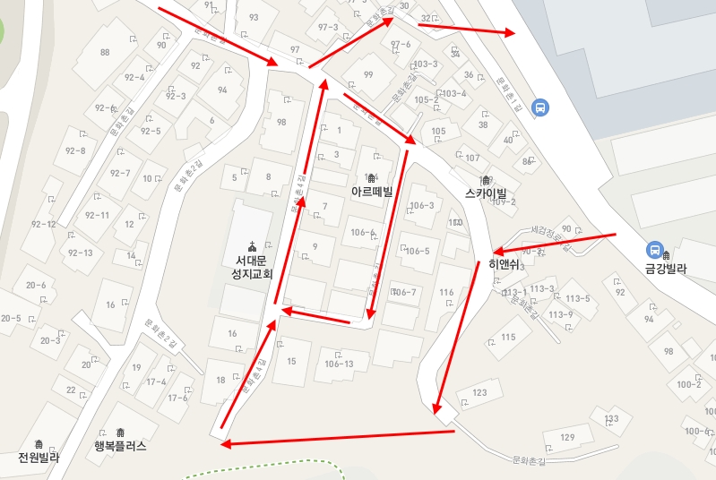 여기서 쭉 내려가서 왼쪽으로 올라가면 바로 협소주택이 나오는데 왼쪽 뒤로 크게 돌아서 갔다.
