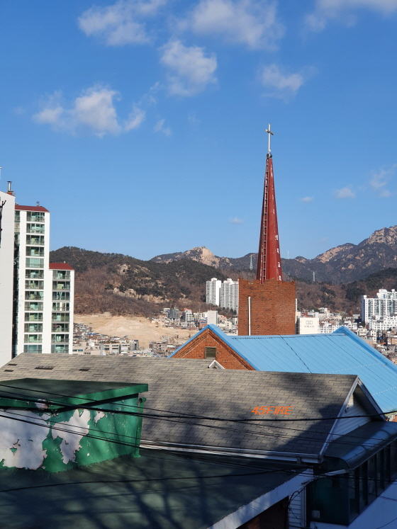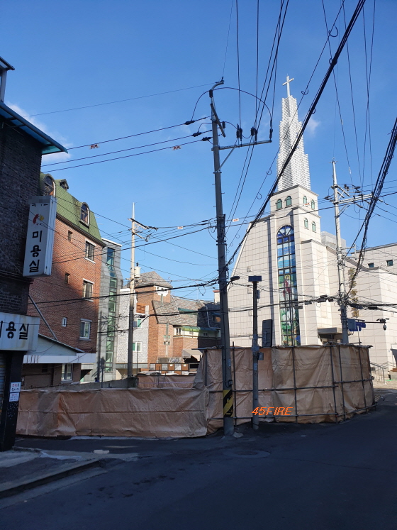 교회탑 왼쪽으로 황량한 땅이 보이는데 저기가 홍은13구역이다. 철거를 마치고 지반을 다지는 공사를 하고 있는 것 같았다.