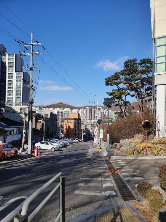 마을버스 정류장이 보인다. 사진 오른쪽이 '인왕중학교'이다. 앞부분으로는 공영주차장이 있고 사진 왼쪽으로는 오래된 주택들이 있다. 그 뒤쪽으로 경매로 나온 협소주택이 위치해 있다.