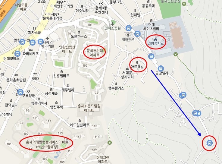 홍제역 근처에는 홍제역 해링턴플레이스 아파트가 공사 중이다. 2021년 12월 준공 예정이다. 홍제3구역을 재개발한 것이다. 홍제동 협소주택은 위 지도에서 '아르떼빌'이라고 표시한 곳 근처이다. 올해 상반기에 저 아르떼빌에서도 경매로 나온 물건이 있었다. 아르떼빌 오른쪽 아래로 파란색 화살표로 표시한 부분 주변이 개미마을이다. 홍제동 협소주택 경매 물건을 보러 가서 개미마을도 둘러보고 왔는데 개미마을 사진은 따로 글을 올리겠다.