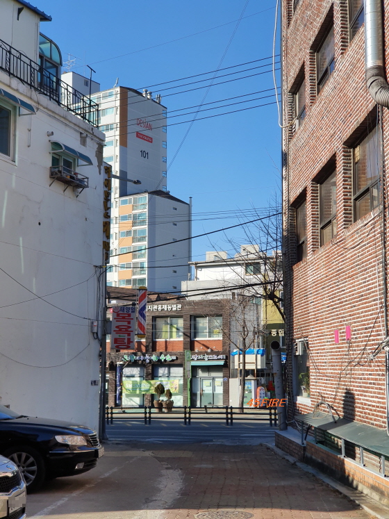 골목을 내려가는 길과 골목 위쪽에 있던 건물