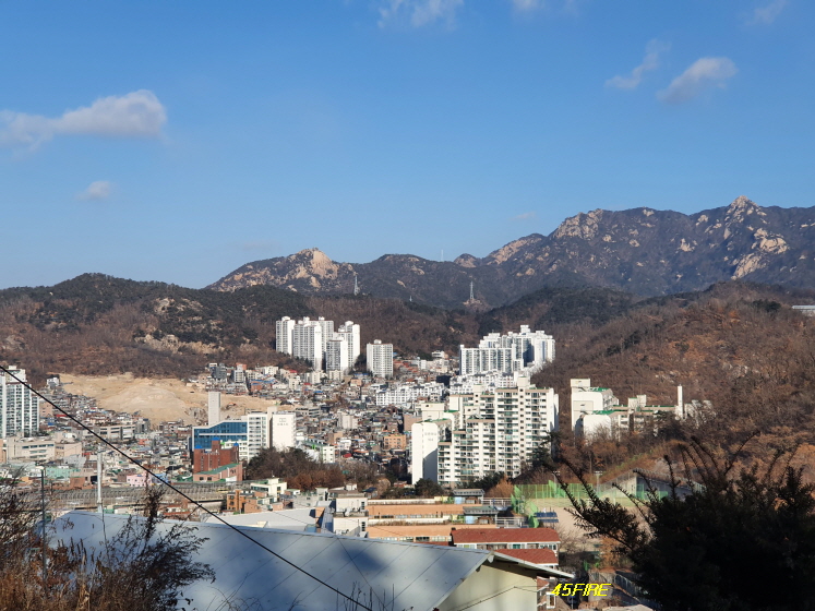바로 앞은 무허가 판자촌이었던 개미마을인데 저 멀리에는 고층 아파트들이 보인다. 홍제동 문화촌 현대아파트, 홍은동 북한산두산위브 아파트 등이다. 사진 오른쪽 중간에 허허벌판도 보이는데, 저기가 홍은13구역이다. 철거를 끝내고 지반을 다지는 토목공사를 하고 있는 것 같았다.