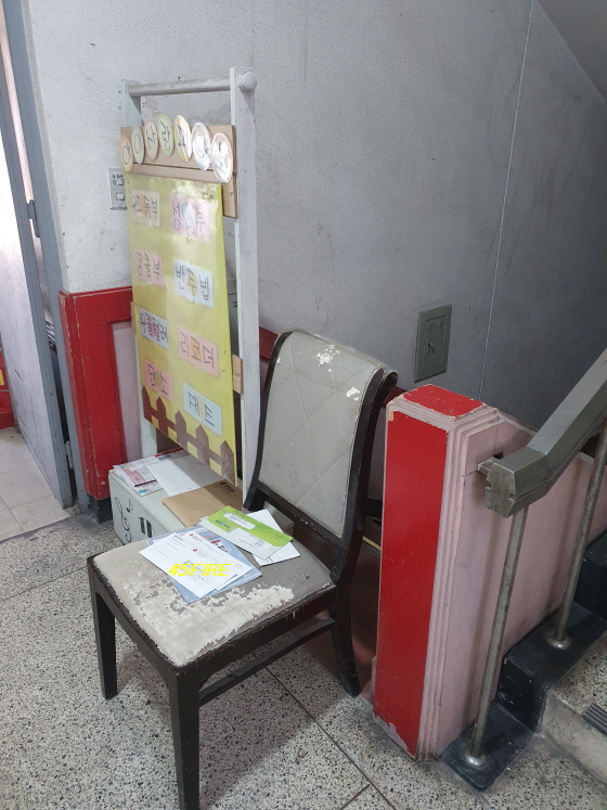 경매 정보지에도 지하층으로 내려가는 계단이 폐쇄되어 있다고 나와 있었는데 실제로도 이렇게 막아 놓았다. 의자 위에 각종 우편물들이 쌓여 있었다.