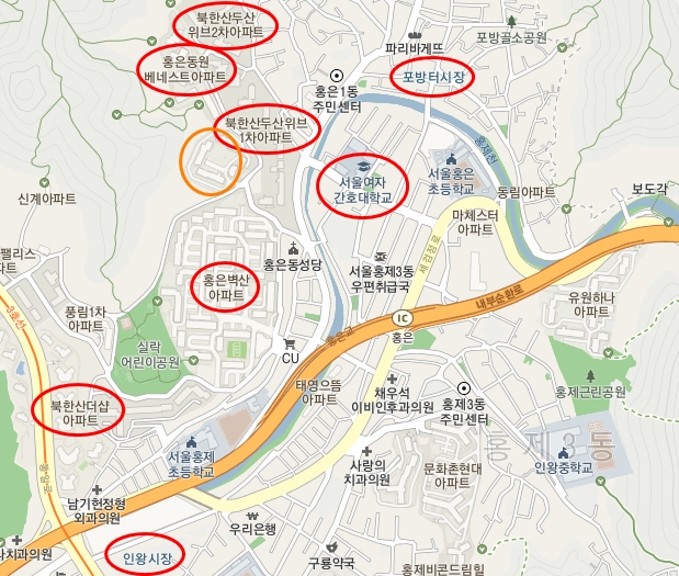 위 지도에는 지하철역이 안 나오는데 인왕시장 아래쪽으로 홍제역이 있다. 경매로 나온 상가가 있는 아파트는 유원홍은아파트로 주황색 원으로 표시한 곳이다. 백종원과 함께 방송에서 자주 언급되었던 '포방터시장'도 홍은동에 있었다.