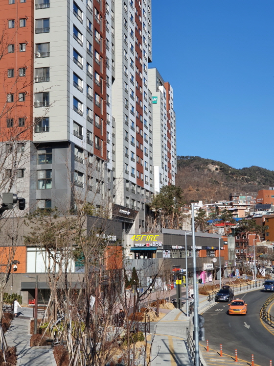 경사가 있어서 그런지 상가 뒤쪽에 있는 북한산두산위브1차 아파트와 단절된 모습이었다.