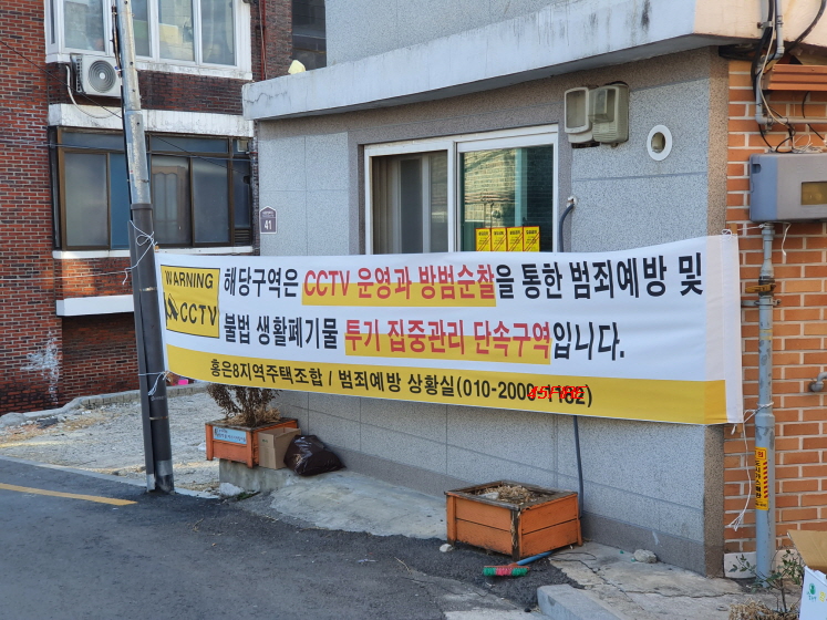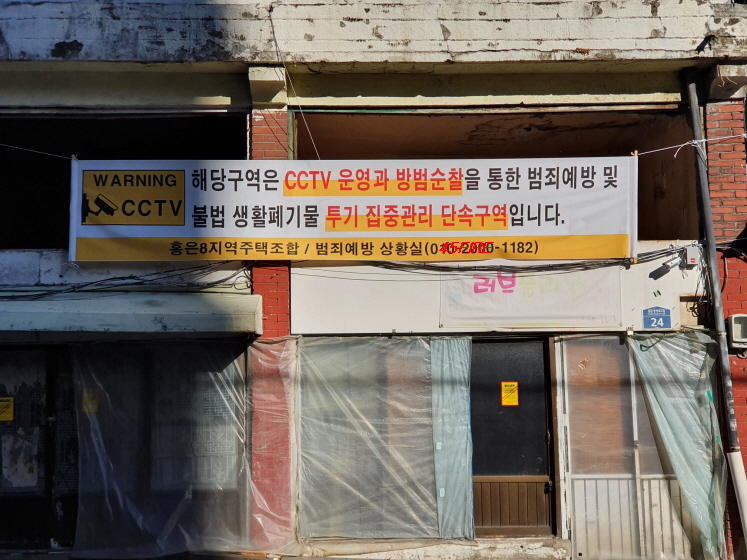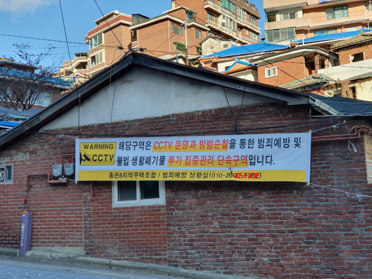 대부분 이주가 끝나고 철거를 앞둔 모습이었다. 빈집에서 발생할 수 있는 범죄를 예방하기 위한 경고문이 곳곳에 부착되어 있었다. 편의상 홍은8구역이라고 하지만 정식 명칭은 '홍은8지역주택조합'이 맞는 것 같다.
