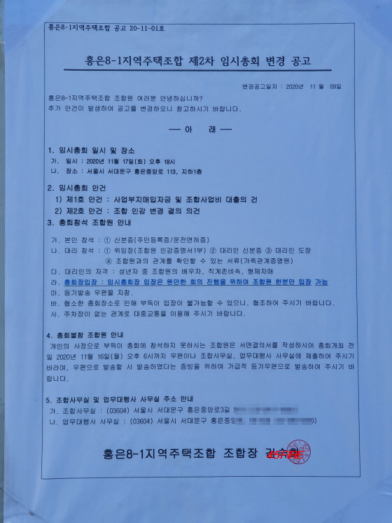 홍은8-1지역주택조합 임시 총회 공고문