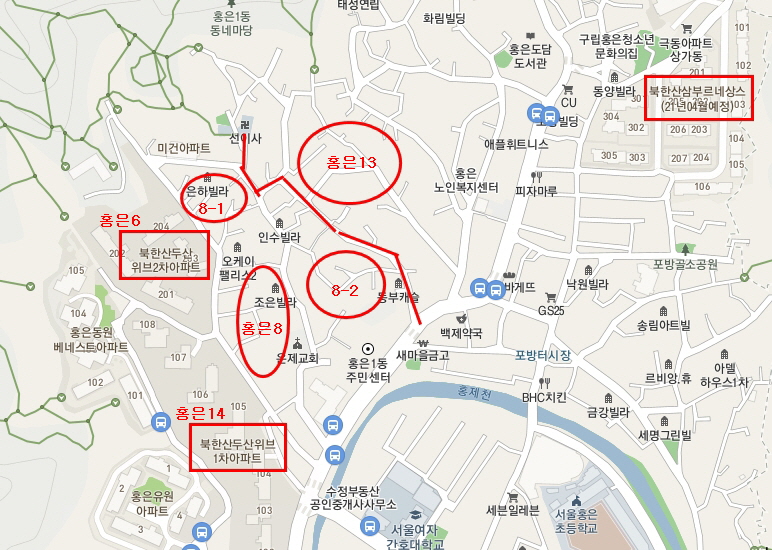 위 지도는 홍은동 재개발 구역을 간단히 표시한 것이다. 홍은14구역과 홍은6구역은 이미 준공이 됐고, 홍은13구역은 철거가 진행 중이다. 그 사이에 홍은8구역, 홍은8-1구역이 위치해 있다. 홍은8구역과 홍은8-1구역을 제외한 나머지 부분을 홍은8-2구역이라고도 하는데 홍은8-2구역은 재개발이 아직 시작도 안 한 것 같았다.