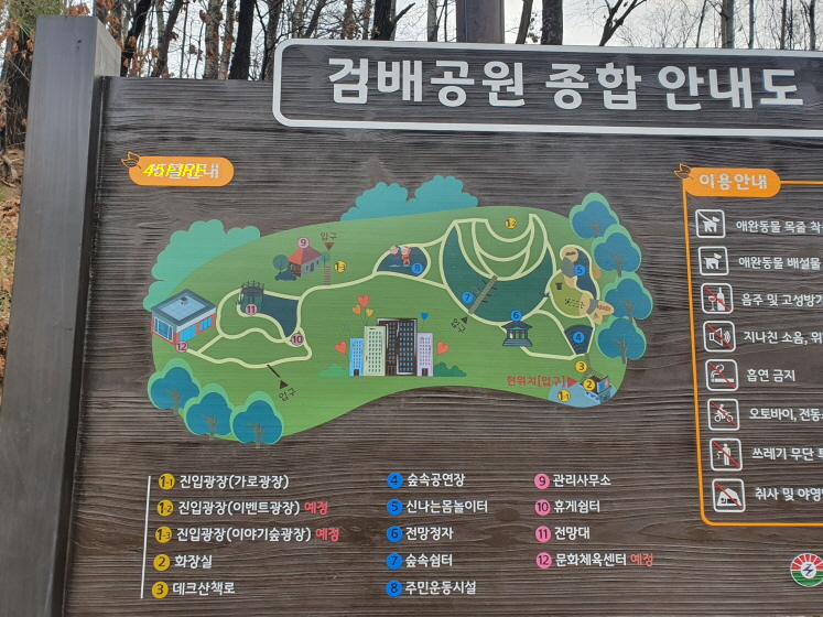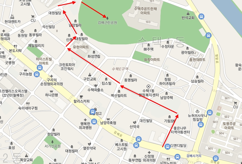 구리시로 가는 버스를 타고 가서 검배 사거리에서 내렸다. 먼저 경매로 매각된 물건이 있는 곳을 보고 수택E구역을 가로질러서 검배근린공원으로 갔다.