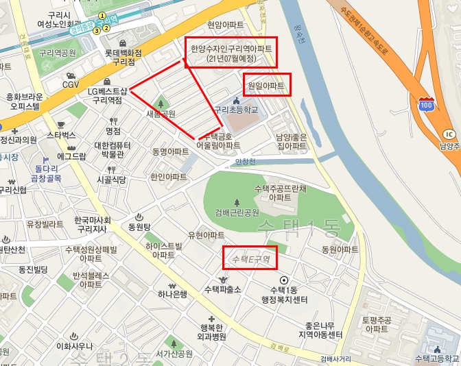 수택E구역은 검배근린공원 아래쪽으로 범위가 꽤 넓다.