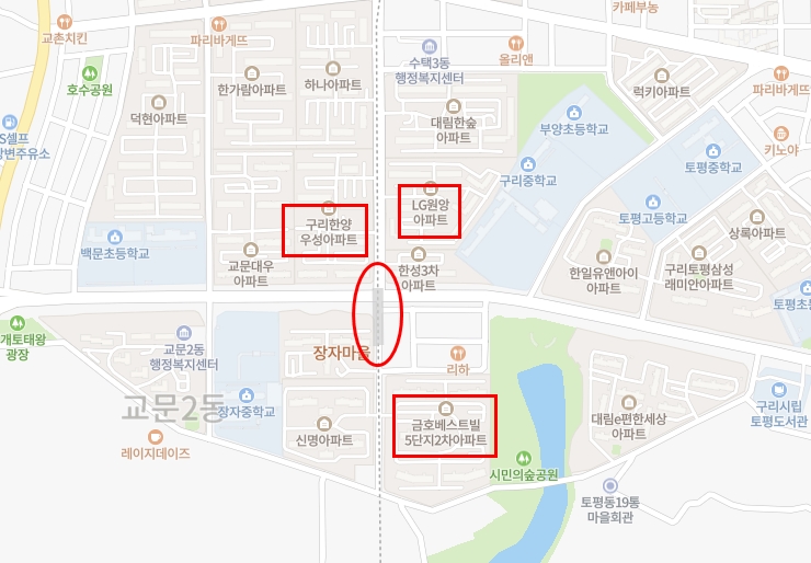 구리시 수택동은 구리역 남측에 있다. 엄밀히 말하면 위 지도에 표시된 지역은 수택2동이고 그 아래쪽도 수택3동이라고 나오는데 법정경계와 행정경계가 다르기 때문이다. 아무튼 위 지도를 기준으로 수택동 위쪽은 인창동, 왼쪽은 교문동, 아래쪽은 토평동이다.