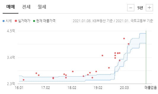 경매로 나온 것과 동일한 면적의 최근 5년 동안의 가격 변화를 나타낸 것이다. 2016년 3월에 2억 5천1백만 원에 실거래가 있었고, 가장 최근은 2020년 5월로 3억 9천7백만 원이었다. 지금 호가는 4억 원에서 4억 4천만 원 정도이다.