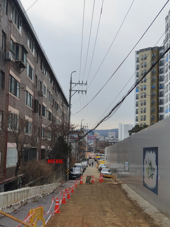 도로 한 가운데 가림막이 없는 곳이 있어서 구경을 하러 들어갔다가 몇 걸음 채 가지도 않았는데 안에 있던 인부가 들어오면 안 된다고 소리쳤다.