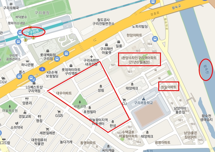 이동했던 경로는 위 지도 오른쪽 아랫 부분의 태양파크와 구리초등학교 사이의 골목으로 가서 원일아파트를 먼저 보고, 그 다음에 한양수자인구리역 아파트 공사 현장을 지나서 수택1지구를 둘러봤다.
