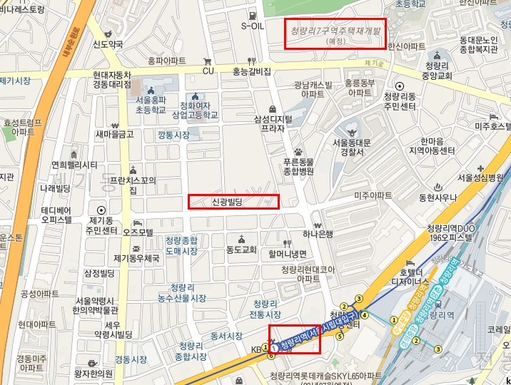위 지도에서 좌측이 용두동이고 우측이 제기동이다. 경매 물건은 바로 그 경계 옆에 있었다.