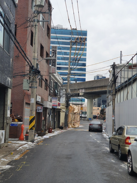 저 앞에 서울숲IT캐슬이 보이고 골목 끝으로 철거를 위한 가림막도 보인다.