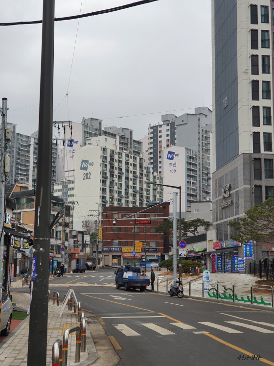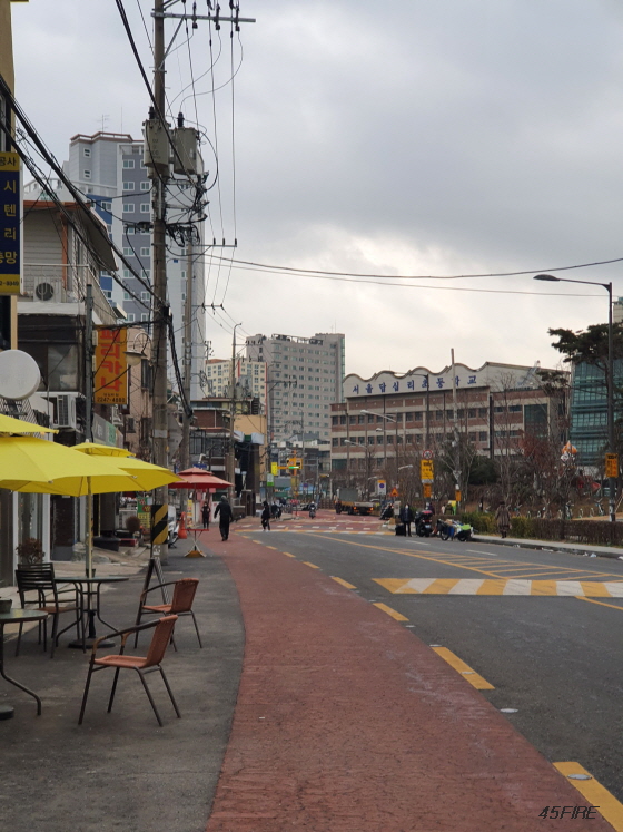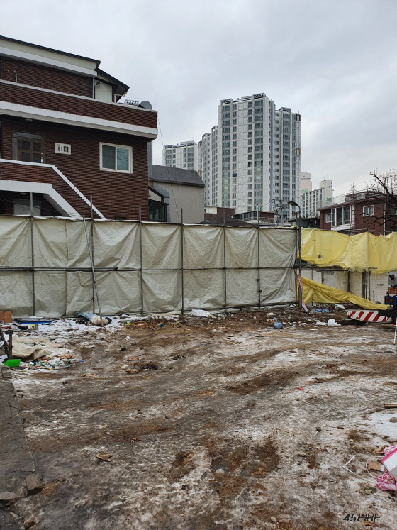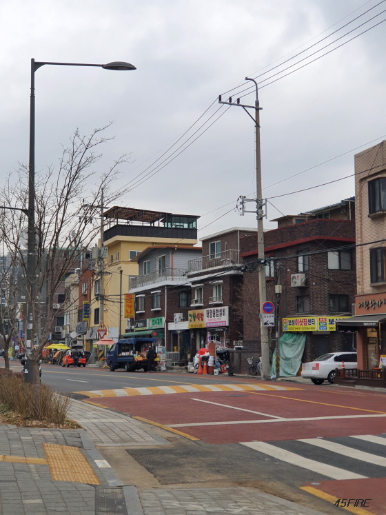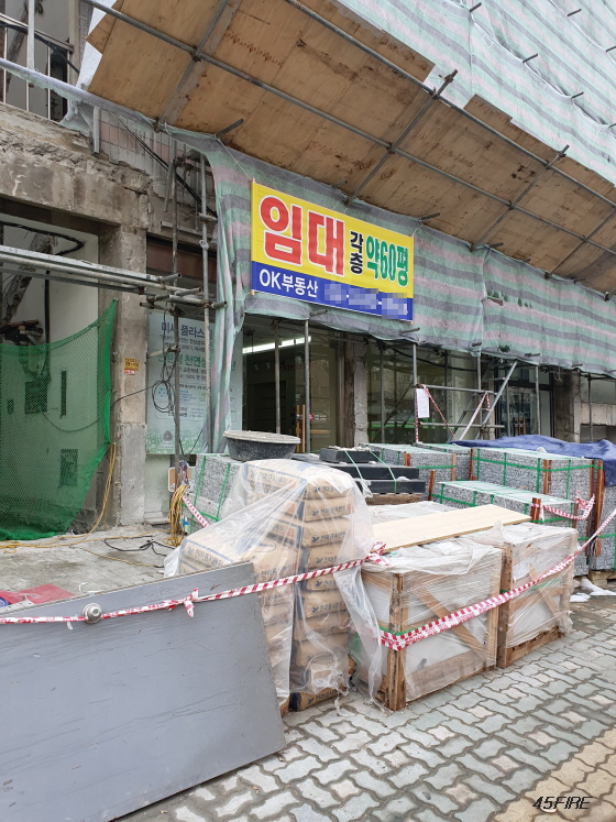 저 멀리 공사 중인 건물이 아까 그 리모델링하는 듯한 상가 건물이다.