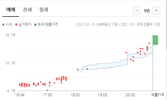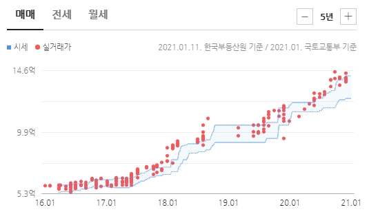 그래프를 보면 래미안 크레시티 역시 5년 전에 비해 가격이 거의 세 배가 되고 있다. 2016년 1월 실거래가는 5억 9천5백만 원이었고, 2020년 12월 최고 실거래가는 14억 4천만 원이었다.