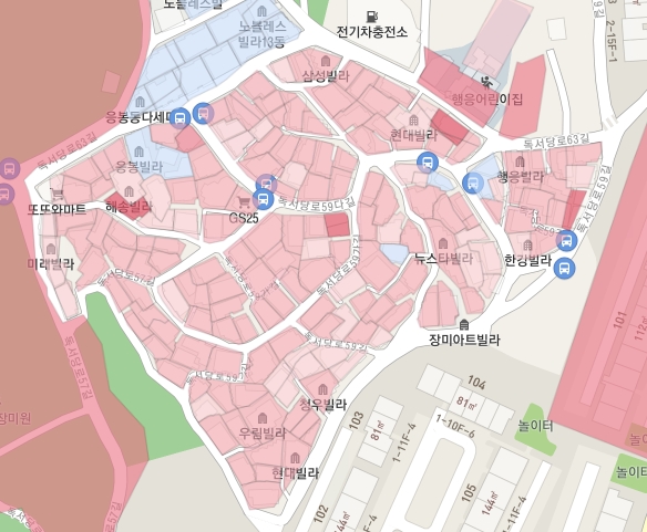 응봉주거환경개선지구는 제1종일반주거지역이다. 그런데 빌라들이 4층 정도로 높다. 대부분 90년대 초반에 지어졌을 것인데... 정확히 기억이 나진 않지만 그 당시 주택 공급을 위해 용적률을 최대로 해줬던가, 추가 용적률을 허용했다던가 아무튼 그랬다고 한다.