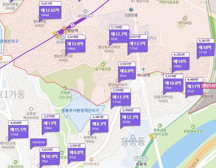아파트 시세를 확인하러 네이버 부동산에 들어갔더니 평당가와 매매가가 한눈에 나왔다. 호갱노노에 잘못 들어간 줄 알았다. 응봉동은 아니지만 행당동 두산위브와 서울숲 리버뷰자이가 평당 5천만 원이 넘는다. 응봉동의 아파트들은 대부분 평당 3천만 원대이고, 대림강변타운아파트가 평당 4천5백만 원 정도로 가장 높다.