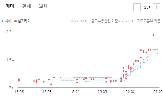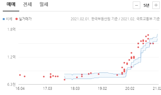 2019년까지는 8,000만 원 정도의 실거래가를 유지했다. 그런데 2019년 말부터 거래도 늘어나고 가격도 상승하기 시작했다. 최근 최고 실거래가는 1억 6천만 원이 넘는다. 1~2년 사이에 두 배가 된 것이다.