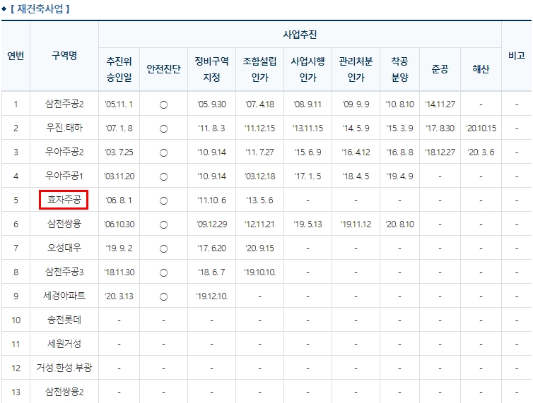 효자주공의 경우 2006년 8월 추진위가 승인됐고, 2011년 10월 정비구역으로 지정됐다. 2013년 5월 조합설립인가가 났다. GS건설과 롯데건설로 시공사 선정을 마쳤고 사업시행인가를 준비 중이라고 한다. 앞으로 재건축 사업이 순조롭게 진행될지 무척 궁금하다.