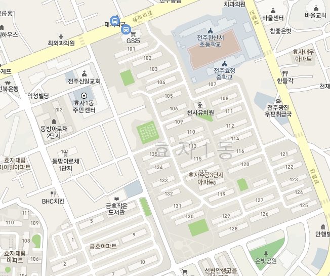 위 지도 가운데 효자1동 주민센터를 표시한 곳 근처에 효자주공3단지 아파트가 있다.