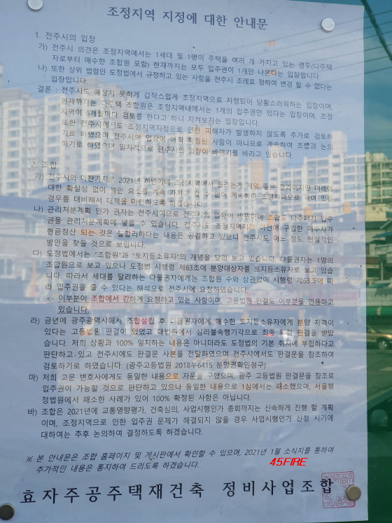 재건축은 2006년부터 말이 나왔는데, 10년 동안 지지부진 하다가 최근 다시 논의가 되고 있는 듯했다. 작년 봄에 정비업체 선정을 위한 입찰공고를 냈다는 기사가 있었다. 찾아보면 더 많은 정보가 나올 것이다. 얼마 전에 전주시 전체가 조정대상지역에 포함되면서 입주권 문제가 생겼다. 한 기사 따르면 입주권을 잃을 가능성이 있는 사람들이 150명이 넘는다고 한다.
