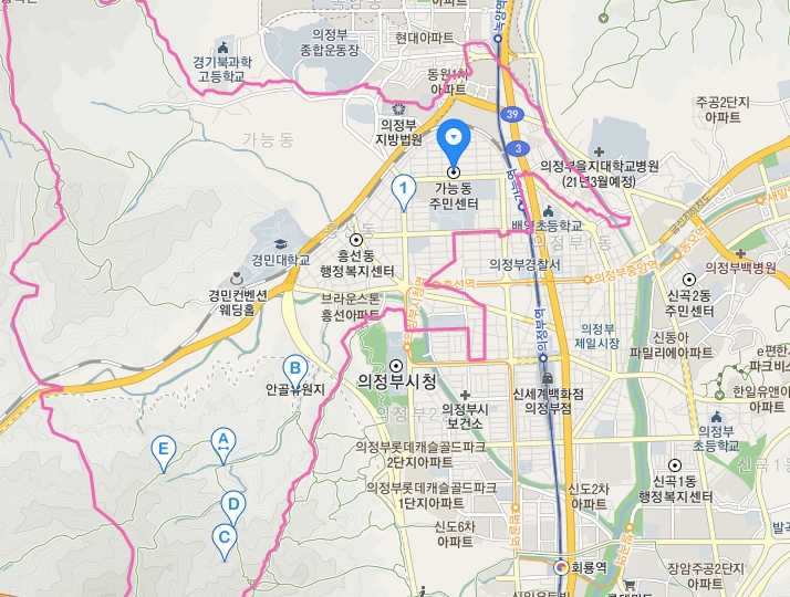 의정부역에서 한 정거장 더 올라가면 '가능역'이 있다. 예전에는 의정부 북부역이라고도 했던 것 같다. 아무튼 재개발을 추진하는 지역은 가능역 좌측으로 가능동 주민센터를 포함한 반원 모양의 구역이다.