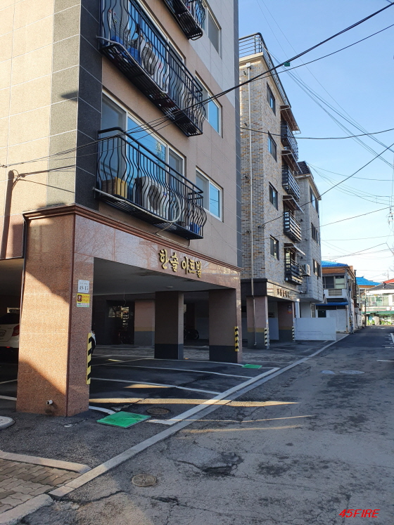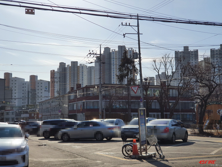 공영 주차장 뒤로 오래된 연립주택과 고층 아파트가 보였다.
