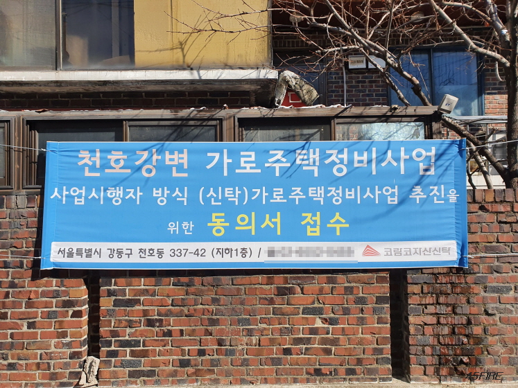 지난 글에서는 신설1구역 공공재개발 후보지를 다루었는데, 신설1구역에서는 재개발 등과 관련된 사무실, 현수막 등을 찾아볼 수 없었다. 그런데 천호동에서는 지역주택조합, 가로주택정비사업 등 여러가지 모습을 볼 수 있었다.