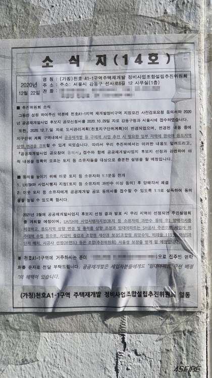 그렇다면 왜 가칭 천호A1-2구역과 천호A1-1구역으로 나누어져 있을까. 부동산이나 추진위 사무실을 방문하면 정답을 쉽게 알 수 있었을텐데, 시간적 여유도 없고 코로나로 인해 접촉을 최대한 피하던 시기였으므로 그러지 않았다.