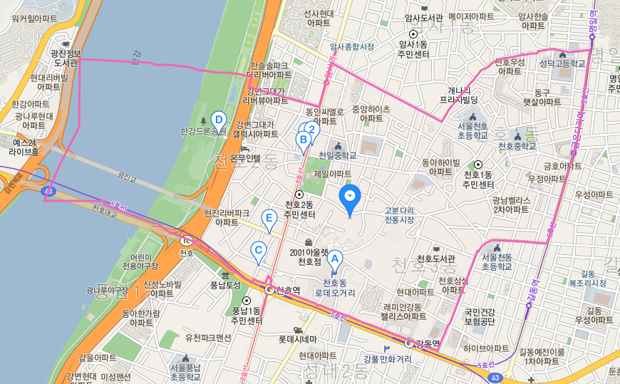 뭐 이렇게 구역들이 많나 했는데, 천호동의 위치를 확인하고 이해가 됐다. 위 지도는 카카오맵에서 천호동을 검색한 결과인데 범위가 상당히 넓다. 천호역, 강동역, 굽은다리역, 암사역까지 천호동의 경계를 이루고 있다. 명일역도 천호동의 경계에서 얼마 안 떨어져있다. '천호동'하면 천호역 주변만 떠올랐는데 실제로는 엄청 넓은 구역이었다.