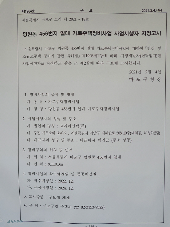 망원동 456번지 일대 가로주택정비사업 사업시행자 지정고시