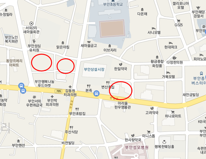 부안상설시장 오른쪽 아래에 있는 원이 '마실공영주차장'을 표시한 것이다.