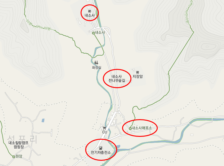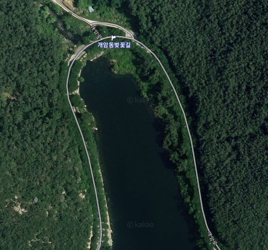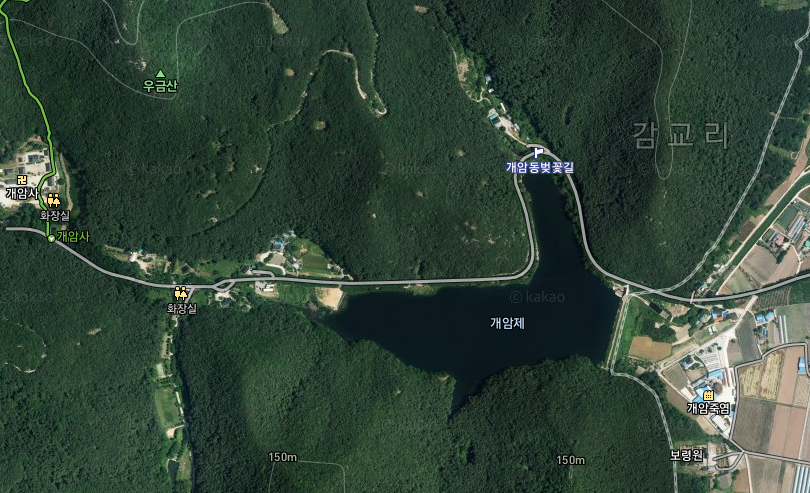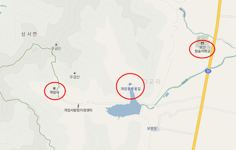 지도를 조금 확대하면 내소사가 보인다. 개암사는 여전히 안 보이는데 우금산 아래쪽에 있다. 우금산 오른쪽으로 표시한 부분에 있는 호수가 개암동 벚꽃길인데, 그 길을 지나서 개암사로 가게 된다. 지금쯤 절정이지 않을까.