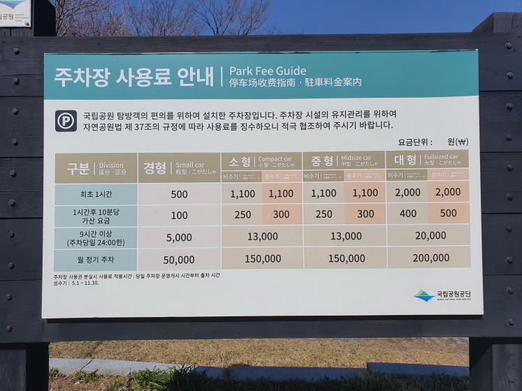 주차공간은 넓은 편이었다. 평일이라 일부는 개방을 안 했다. 고령자가 있는 경우 매표소에 말하고 더 위쪽까지 차를 가지고 올라가는 것 같았다.