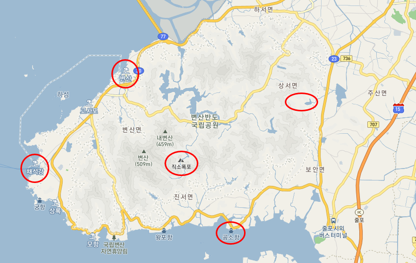 변산반도 국립공원에 이런저런 관광지들이 많다. 그중 몇 군데만 표시해봤다. 위 지도에서는 내소사와 개암사가 따로 안 나오는데, 내소사는 직소폭포 근처에 있고, 개암사는 오른쪽에 빨강색 원으로 표시했다. 그 원 안에 작은 호수가 있는데 그 주변이 개암동 벚꽃길이다.