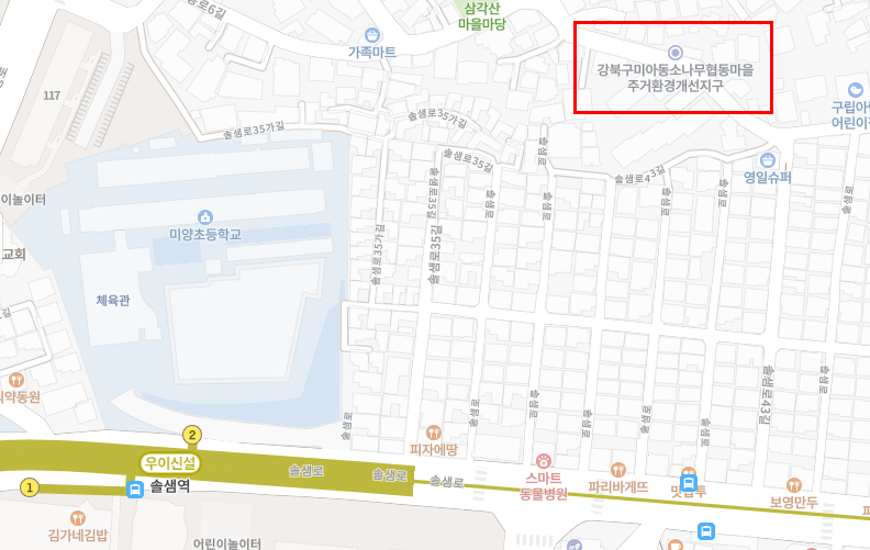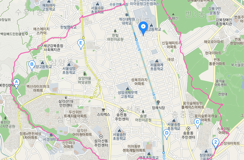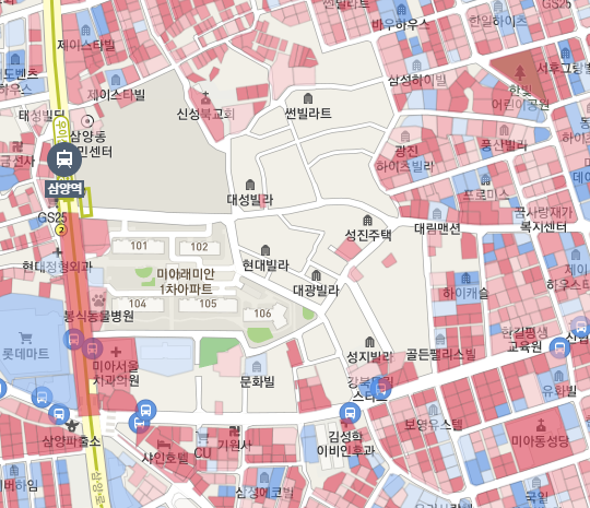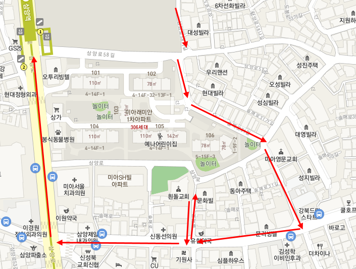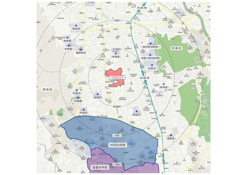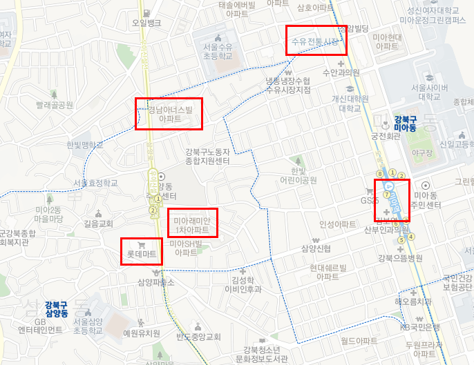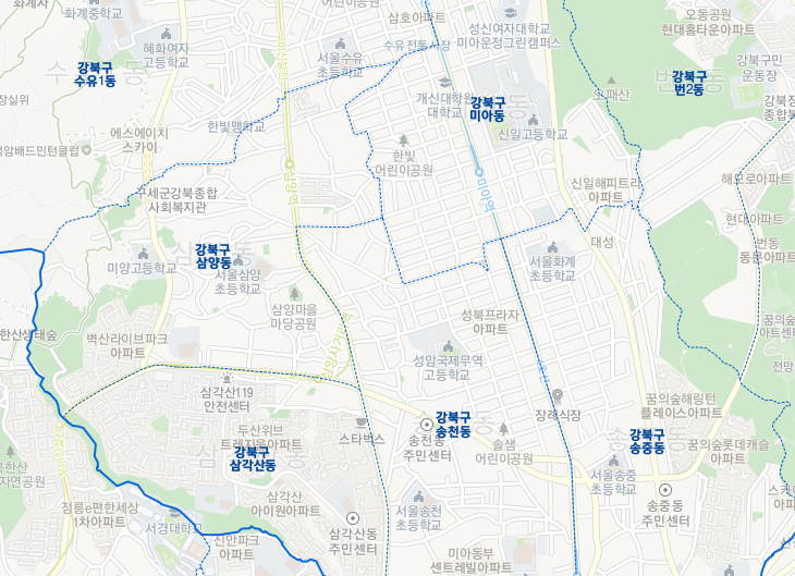 위 지도처럼 미아동은 규모가 크다. 4호선 미아역, 미아사거리역이 포함되고, 수유역은 미아동 밖에 있지만 그리 멀지 않다. 그리고 우이신설선 솔샘역, 삼양사거리역, 삼양역이 포함된다. 이 글의 초반부에는 삼양역 주변부가 등장하고, 후반부에는 솔샘역과 삼양사거리역 사이의 북측을 다룬다.