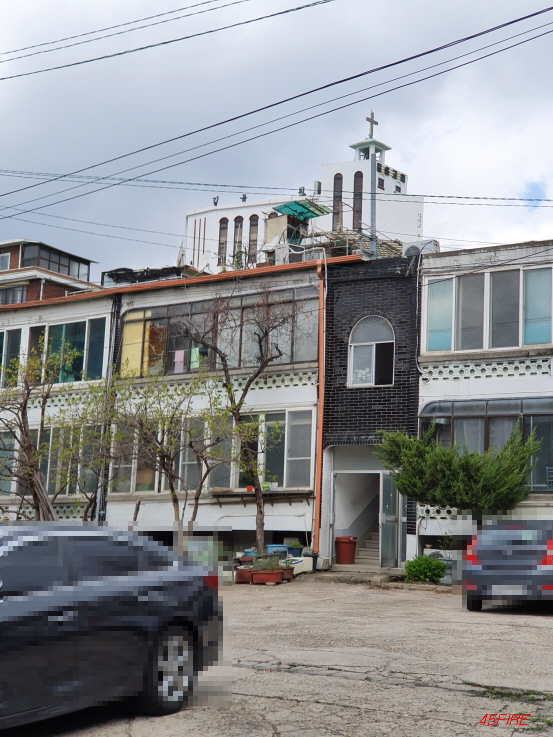 저 앞에 보이는 건물이 롯데마트인데, 그 앞으로 보이는 긴 건물이 일심연립이다.