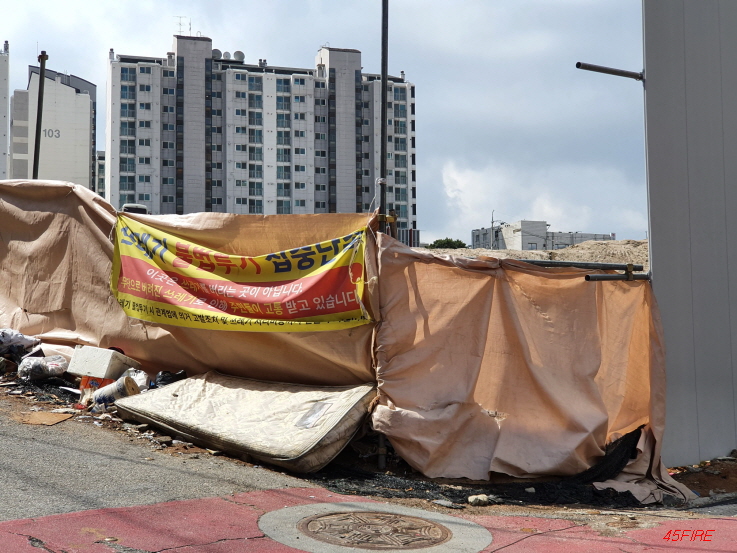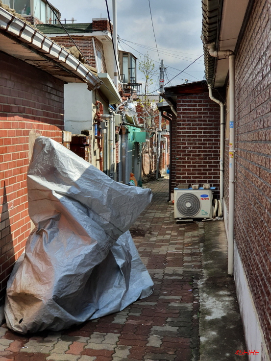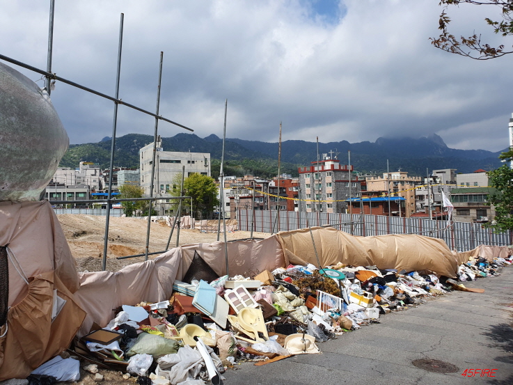 철거를 하면서 나온 폐기물들인지, 누군가가 버리고 간 쓰레기들인지, 아무튼 오래된 주택에서 나온 석면이라도 있을까봐 긴장을 하고 지나갔다.
