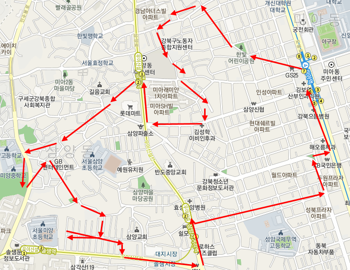 강북구 미아동(삼양동) 임장에서 이동했던 경로이다. 미아역에서 출발해서 미아11구역, 미아3구역, 소나무협동마을 정도만 보고 솔샘역에서 돌아오려고 했는데 다시 미아역까지 돌아갔다. 일심연립도 지도에 표시해놔서 들렀고, 예전부터 관심을 가지고 있었던 대지지분 없는 경매 물건들도 몇 개 보고 왔다.