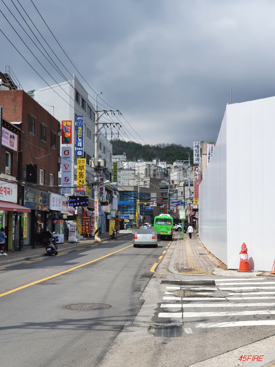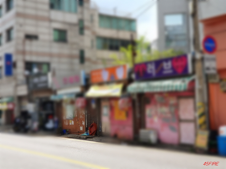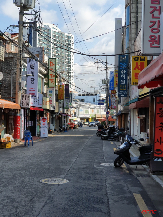 도로는 깔끔한데, 앞에 보이는 건물은 낡았다.