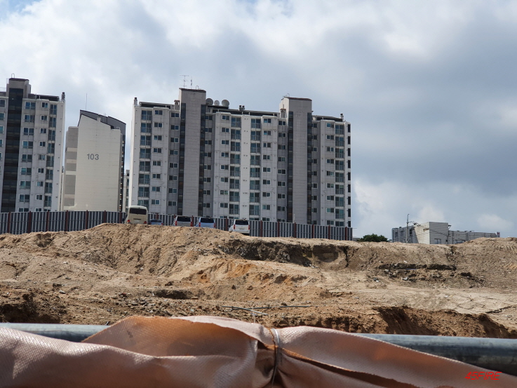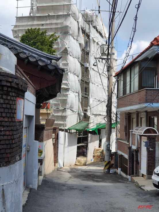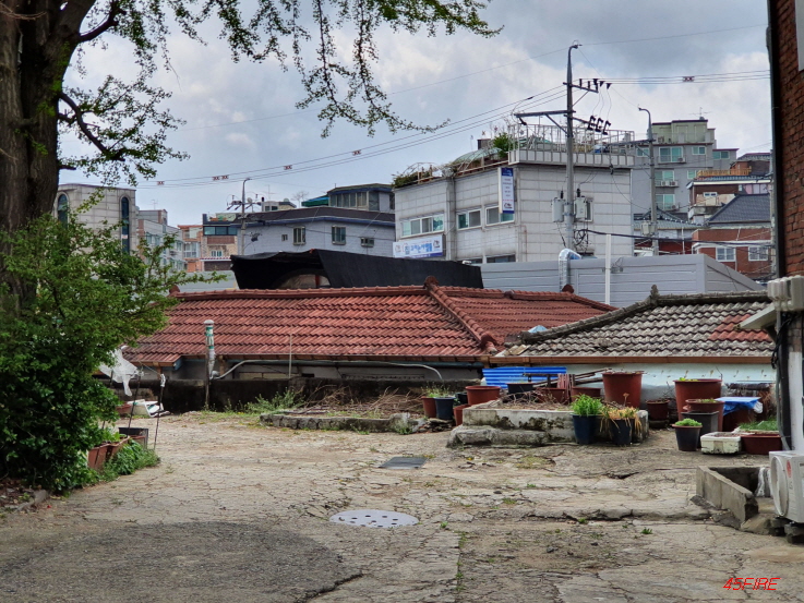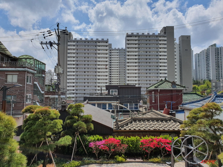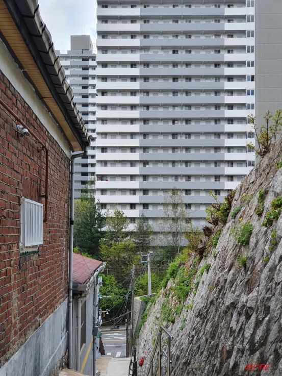 앞쪽으로 보이는 고층 아파트와 대조적이다.