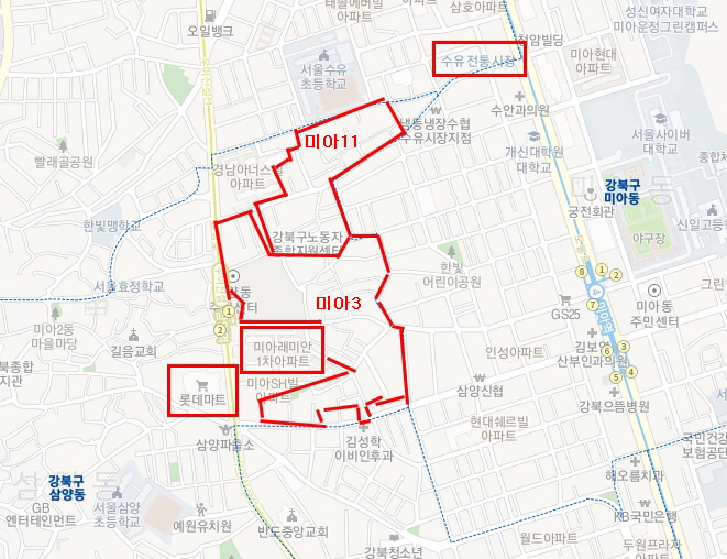 행정경계를 보면 명확하다. 미아동은 미아역 주변을 의미하고 이번에 다녀온 곳은 사실상 삼양동이다. 미아11구역, 미아3구역, 일심연립, 소나무협동마을이 모두 강북구 삼양동에 속한다. 이 글의 제목도 '강북구 삼양동 임장'으로 하는 것이 더 정확하겠다.