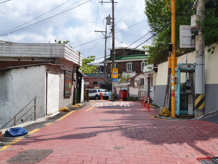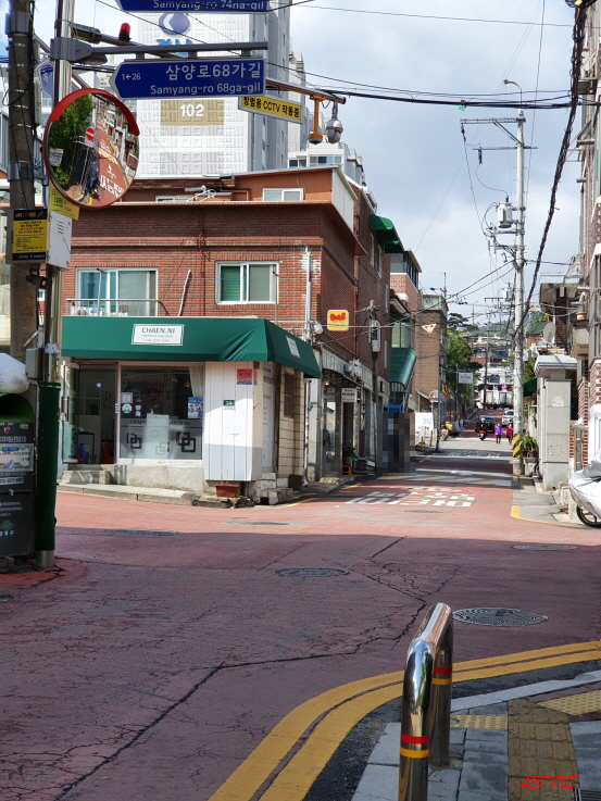 역시 가운데로 중심이 되는 도로다. 폭도 비슷하게 넓었다. 다만 경사는 없을 줄 알았는데 경사가 있다. 소나무 협동마을에 오기 전에는 솔샘역을 지나는 우이신설선 라인부터 위쪽으로 갈수록 경사가 심해질 것으로 예상했다. 로드뷰를 봤을 때도 그렇게 보였다. 그런데 가로 방향으로도 경사가 있었다. 중심부에서 서쪽으로 갈수록 경사가 높아졌다가 다시 낮아지는 그런 지형이었다.